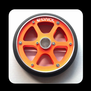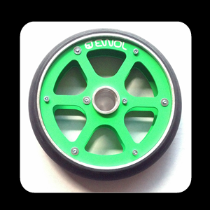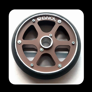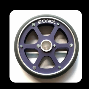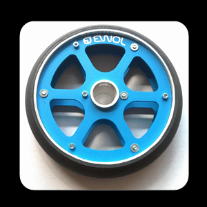 Polyurethane tire on a aluminium rim. Light Aluminum hubs make a medium light, but very fast wheel.